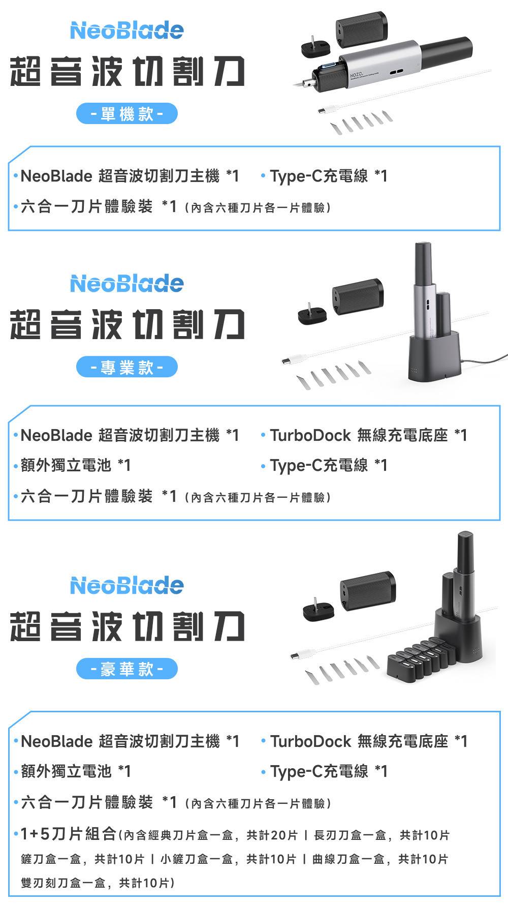 NeoBlade 有 1+5種專用刀片盒。與傳統切割刀相比,NeoBlade的專用刀片盒設計採用模組化連接結構,一共6種不同刀片盒可供選擇,每盒內含大容量刀片 經典刀片*20片、長刃刀*10片、鏟刀*10片、小鏟刀*10片、曲線刀*10片、雙刃刻刀*10片;換刀無需額外工具或繁瑣步驟,靈活面對各類切割需求,針對不同使用場景優化;精細的修整工作,還是大範圍的切割任務,都輕鬆應對。