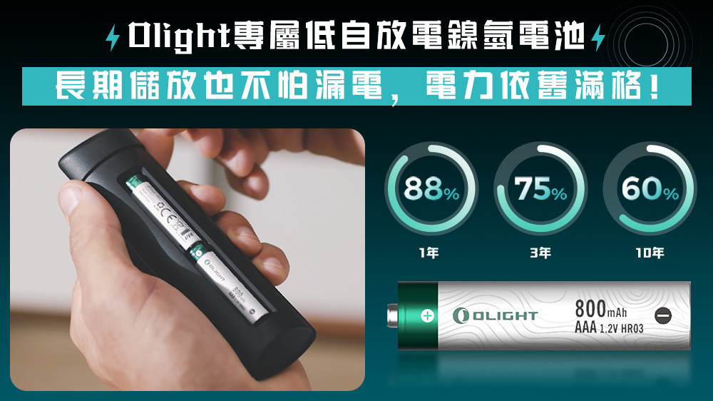 Olight 品牌推出的 Ni-MH 1.2V 鎳氫電池還具備低自放電技術:即使長期閒置,也不會像傳統電池那樣「自己漏電沒電」— 1 年後依然保留 88% 電量、3 年後 75%、即使 10 年後也還有 60% 的剩餘電量。對於需要穩定輸出的裝置,可搭配 3,150 mWh ≈ 2100mAh 的 Olight 智慧鋰電;一般家電情境則以 800 mAh 鎳氫電池長效待命。就算你把它放在抽屜一年半再拿出來,依然能馬上上工,可見 Ostation 2 真的是專業「保養達人」;在它的照顧下,電池不僅工作時表現穩,休假時也不偷懶,真正做到用得久、放得住、管得清。