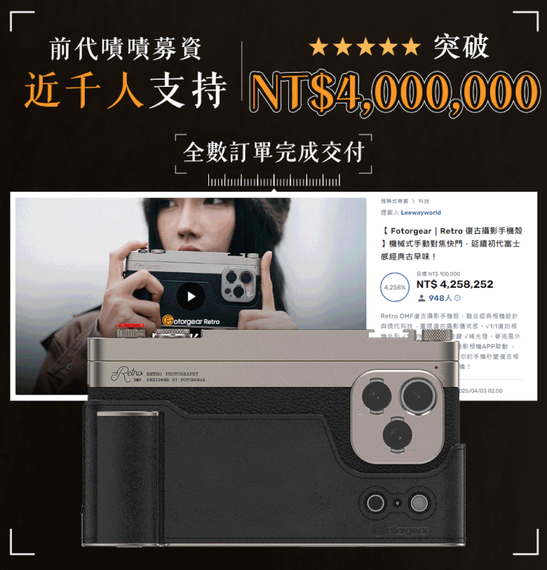 Fotorgear 以「讓復古影像重新走進日常」為品牌核心,將經典相機的靈魂以現代工藝重新詮釋。iPhone 15 與 iPhone 16 系列,在台灣皆獲得亮眼迴響——不只是外型復古,更是把相機的手感、儀式感與影像美學真正帶回使用者手中。團隊擅長拆解並重構老相機的經典細節,結合金屬結構、機械旋鈕、細緻觸感與最新手機攝影技術,讓手機不再只是工具,而是一件能激發創作欲望的影像器材。